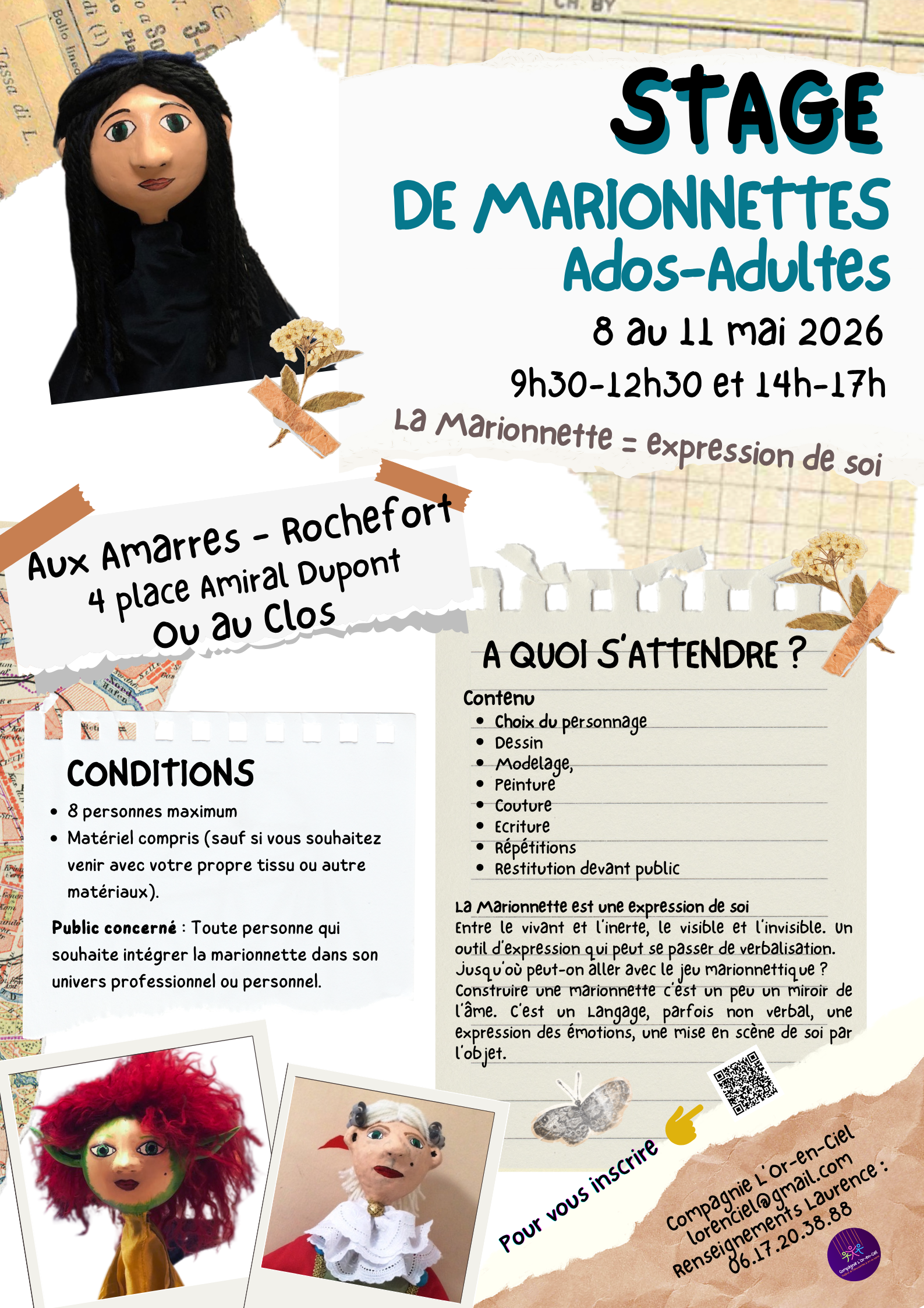 Le stage aborde toutes les étapes de création : réflexion autour du personnage, choix des matériaux, construction, assemblage, finitions et premières mises en jeu. Une attention particulière est portée à la relation entre la forme, le geste et l’intention expressive, afin que chaque marionnette devienne un véritable outil de narration et de jeu.